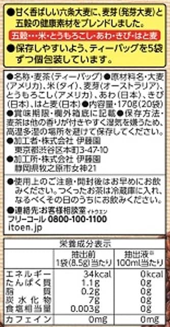 香り高いむぎ茶に、五穀の健康素材(お米・とうもろこし・あわ・きび・はと麦)をブレンドした甘く香ばしい、お湯でも水でもおいしくいただける1L用のティーバッグブレンドむぎ茶です。