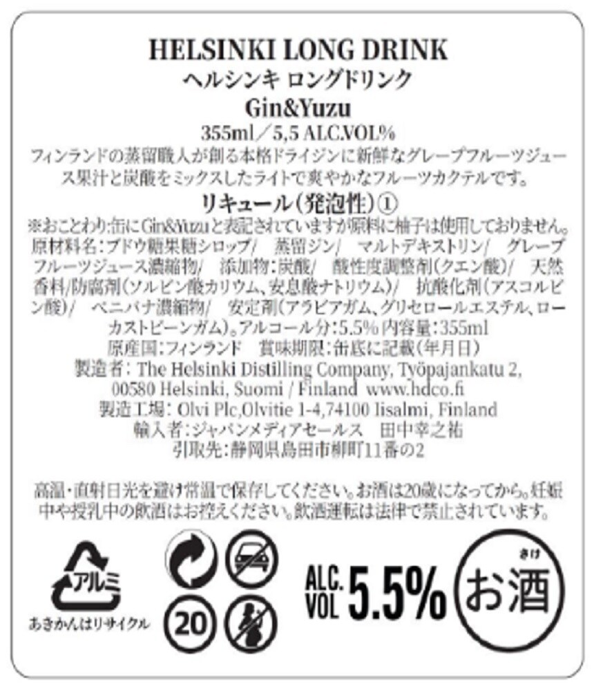 ・ヘルシンキ ロングドリンク ジン&Yuzu風 355ml×24本 - 賞味期限