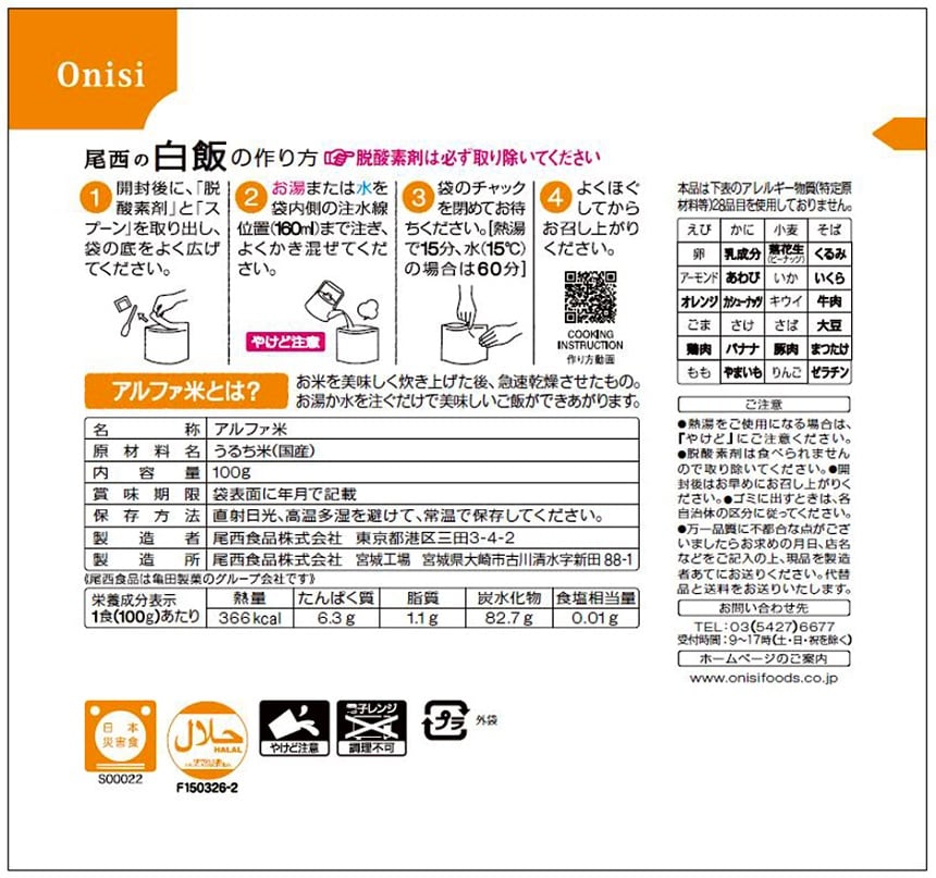 「尾西のアルファ米白飯1食分」は国産のうるち米だけを使用しています。