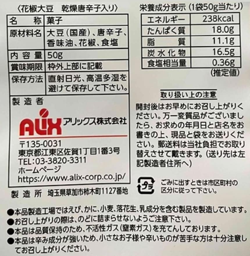 【初回限定】[10袋]アリックス 花椒大豆 乾燥唐辛子入り 50g | 痺れる辛さ引き立つ花椒で味付けした煎り大豆に、乾燥唐辛子をミックスしました。