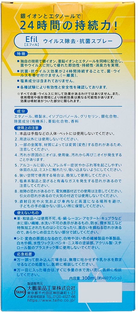 Efil(エフィル)は銀イオン、亜鉛イオンとエタノールを同時に配合した抗菌・ウイルス除去スプレーです。