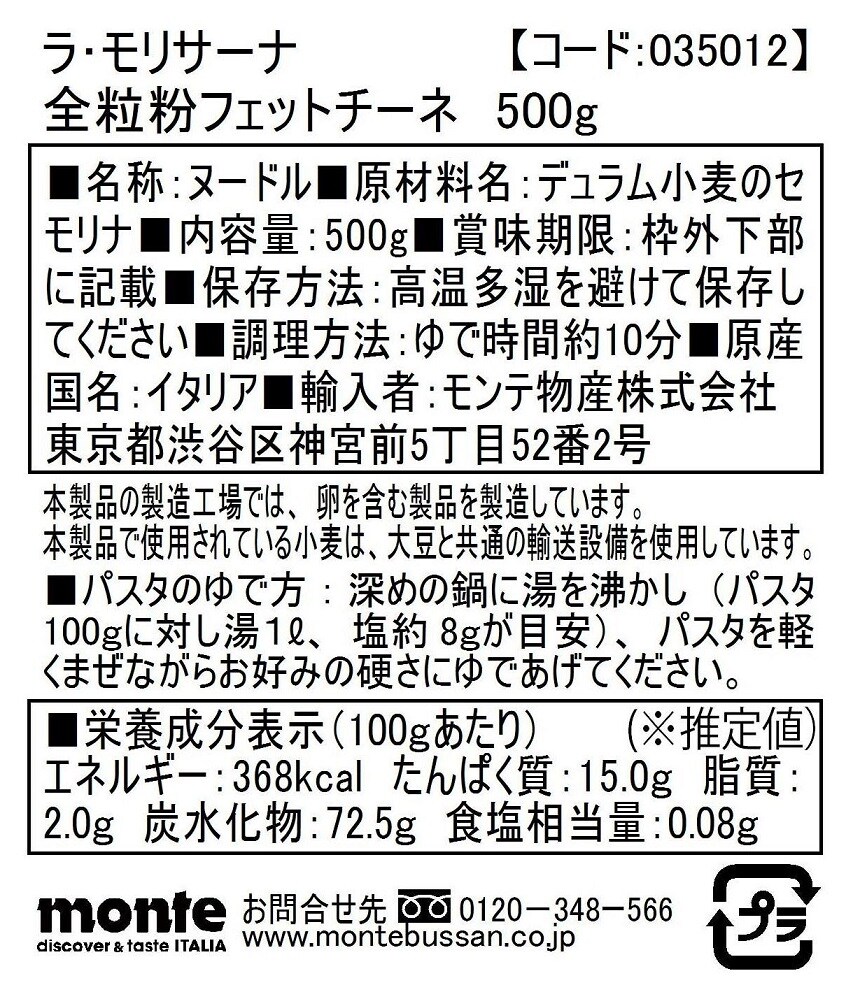 [12袋]モンテ物産 ラ・モリサーナ 全粒粉フェットチーネ 500g | 2012年に創業100年を迎えた伝統あるパスタメーカーです