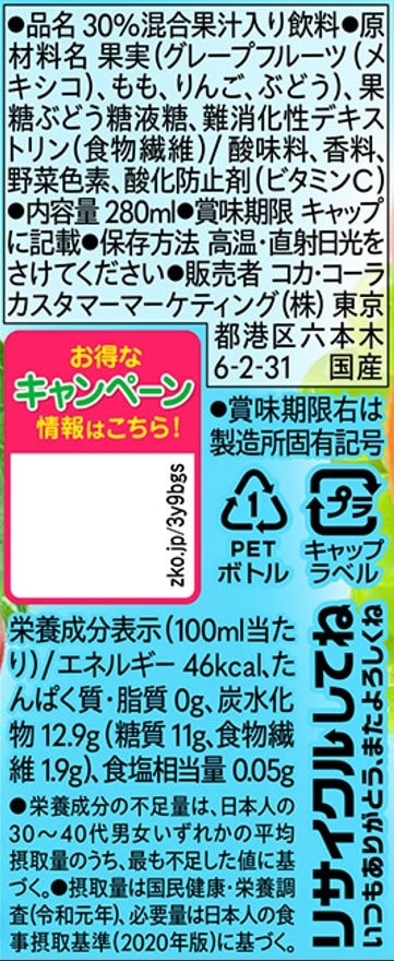- ミニッツメイド ぎゅっ!とフルーツ ピンクグレープフルーツブレンド 食物繊維 280ml PET