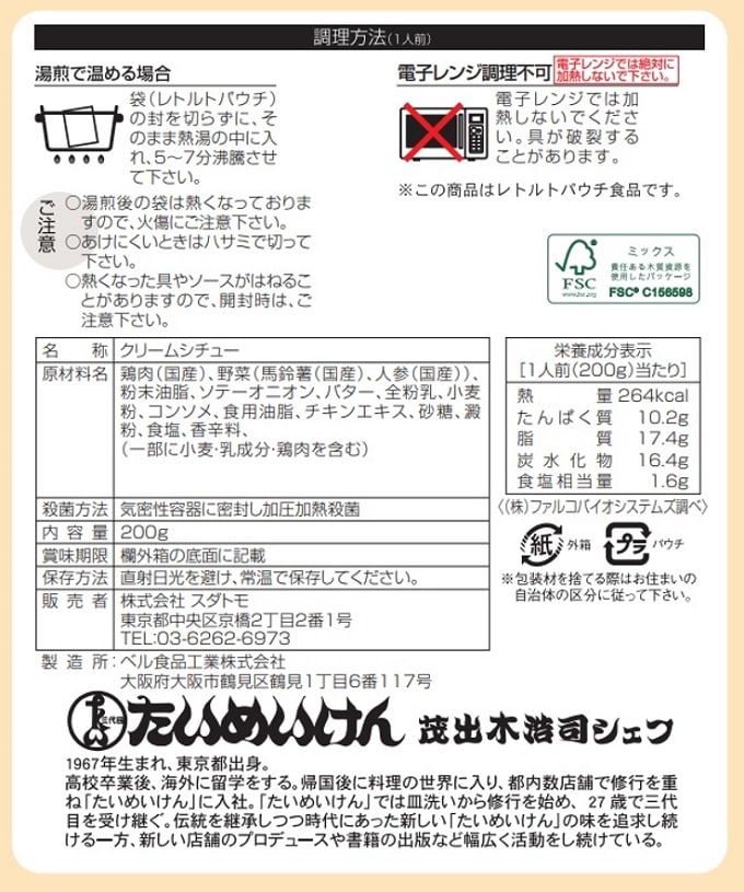 昭和6年創業老舗洋食店「たいめいけん」の三代目茂出木浩司シェフ監修レトルトクリームシチュー。