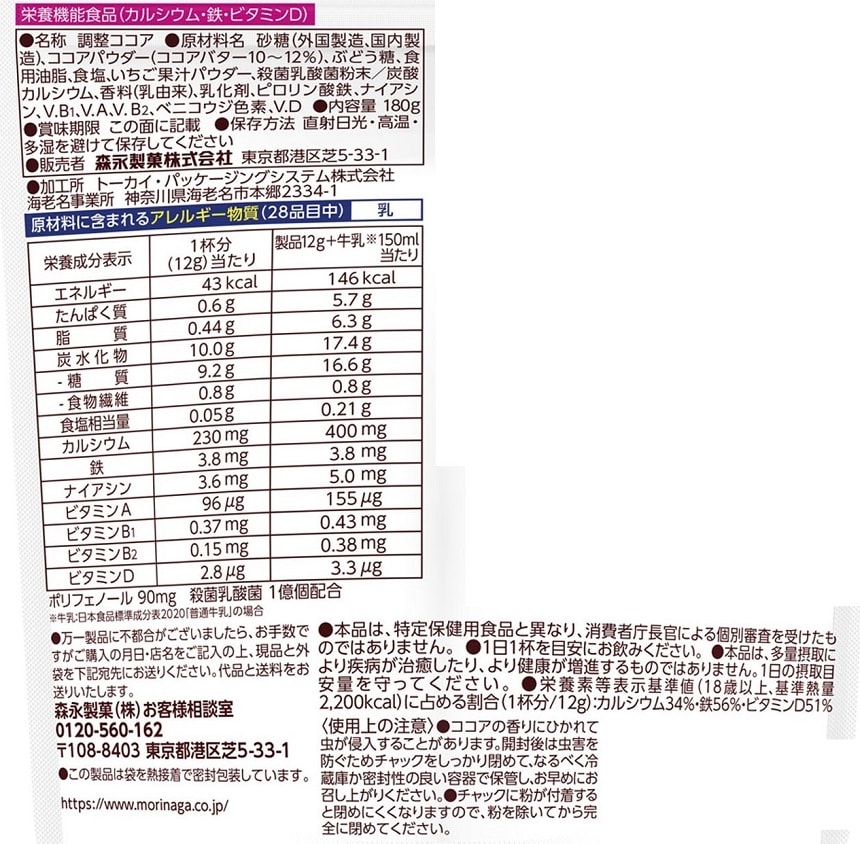 1杯(商品12g+牛乳150ml)でカルシウム・鉄・ビタミンDを1日の1/2量摂れます。