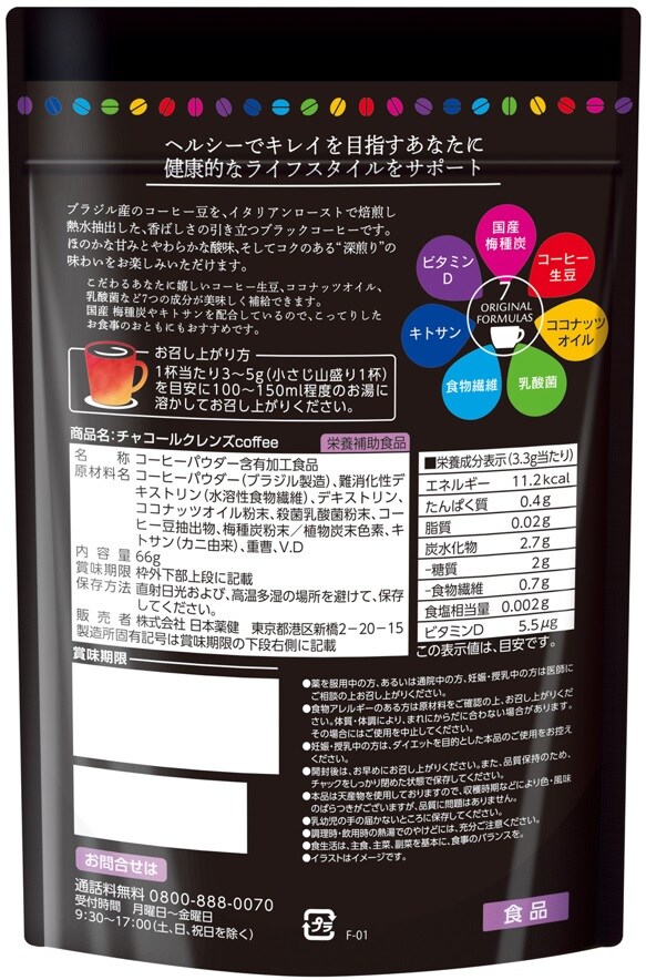 [24袋]日本薬健 チャコールクレンズcoffee 66g | コーヒー生豆、乳酸菌、ココナッツオイルなど7つの成分が美味しく補給できます。
