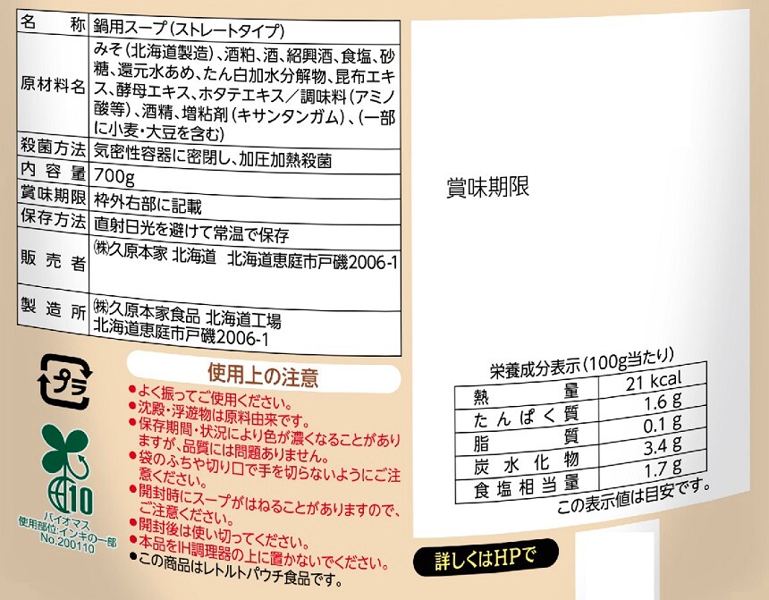みそ(国内製造)、だし(焼きあご、かつお節、さば節、昆布)、砂糖、食塩、還元水あめ、たん白加水分解物、チキンエキス、酵母エキス、魚醤(かつお)、ホタテエキス、みりん、かつお節エキス、香辛料/調味料(アミノ酸等)、酒精、安定剤(キサンタンガム)、(一部に小麦・さば・大豆・鶏肉を含む)