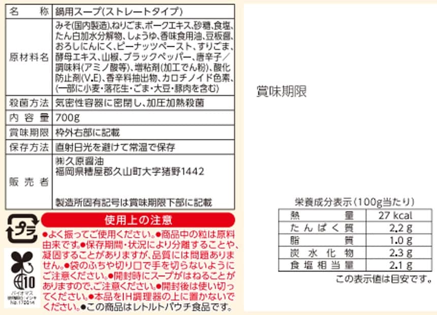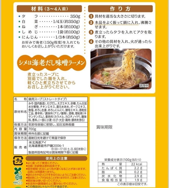 みそ(国内製造)、だし(焼きあご、かつお節、さば節、昆布)、砂糖、食塩、還元水あめ、たん白加水分解物、チキンエキス、酵母エキス、魚醤(かつお)、ホタテエキス、みりん、かつお節エキス、香辛料/調味料(アミノ酸等)、酒精、安定剤(キサンタンガム)、(一部に小麦・さば・大豆・鶏肉を含む)
