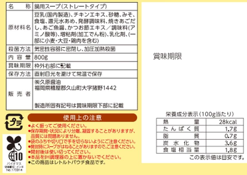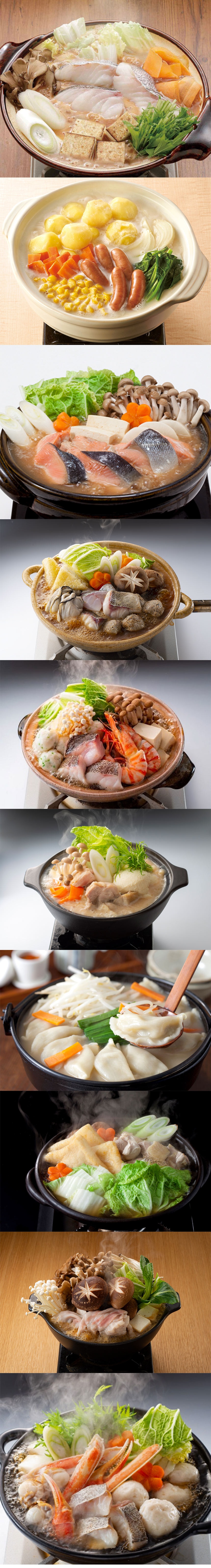 焼きあごだし(飛び魚)に鶏や豚と魚介の旨みを合わせた塩味の寄せ鍋つゆです。