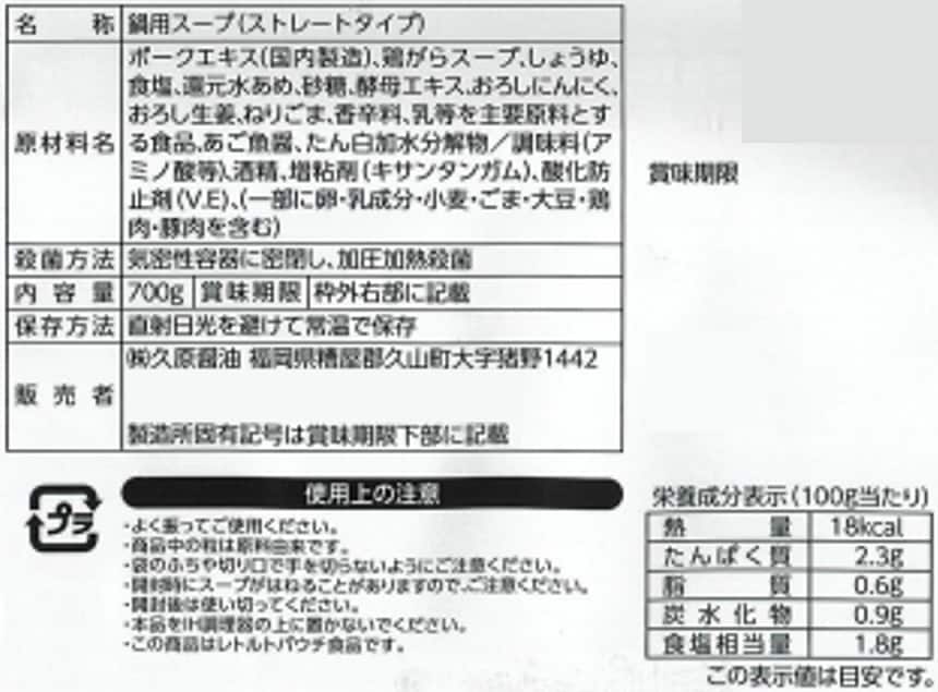 たん白加水分解物(国内製造)、食塩、砂糖、焼きあごだし、チキンエキス、ポークエキス、かつお節エキス、香辛料、魚醤(かつお)、昆布エキス、ホタテエキス/調味料(アミノ酸等)、酒精、安定剤(キサンタンガム)、(一部に小麦・大豆・鶏肉・豚肉を含む)