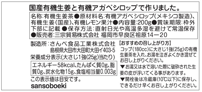 [6個]三宗貿易 有機生姜茶 200g | 国産有機生姜をアガベシロップに漬け込みました。食物繊維たっぷり。香料・保存料・化学調味料無添加!
