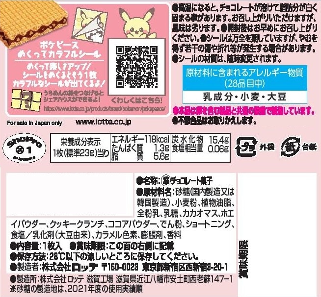 [120枚]ロッテ ポケピースウエハースチョコ 1枚入 | ポケピースに登場するポケモンのシール入りウエハースチョコです。めくってカラフルシールは全24種類。