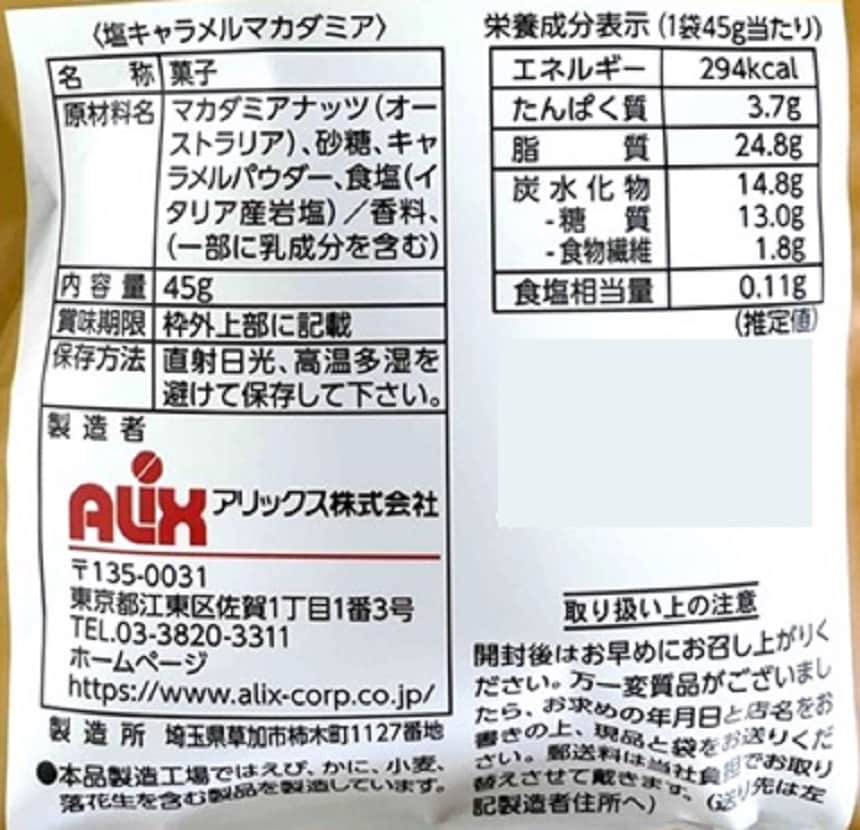 [30袋]アリックス プレミアムポケッツ塩キャラメルマカダミア 45g | キャラメルのカリッとした歯ごたえとマカダミアの柔らかい食感が特徴です。