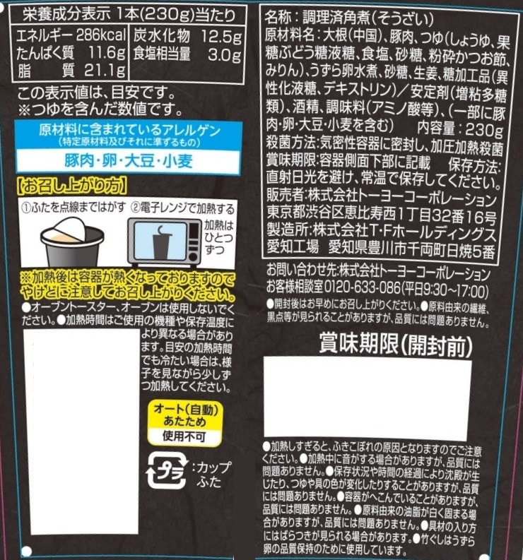 本醸造しょうゆベースに国産かつお節の旨味を加え、ほんのり生姜をきかせたつゆでじっくり煮込み、柔らかくほろほろとした食感に仕上げた豚肉の他、だいこんとうずら卵が入った贅沢な一品です。