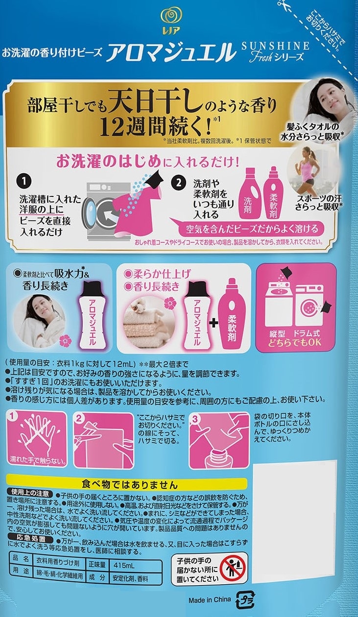 部屋干しでも天日干しのような香り12週間続く!※1 髪ふくタオルの水分さらっと吸収※スポーツの汗さらっと吸収※柔軟剤と比べて吸水力※&香り長続きお洗濯のはじめに入れるだけ!縦型ドラム式どちらでもOK