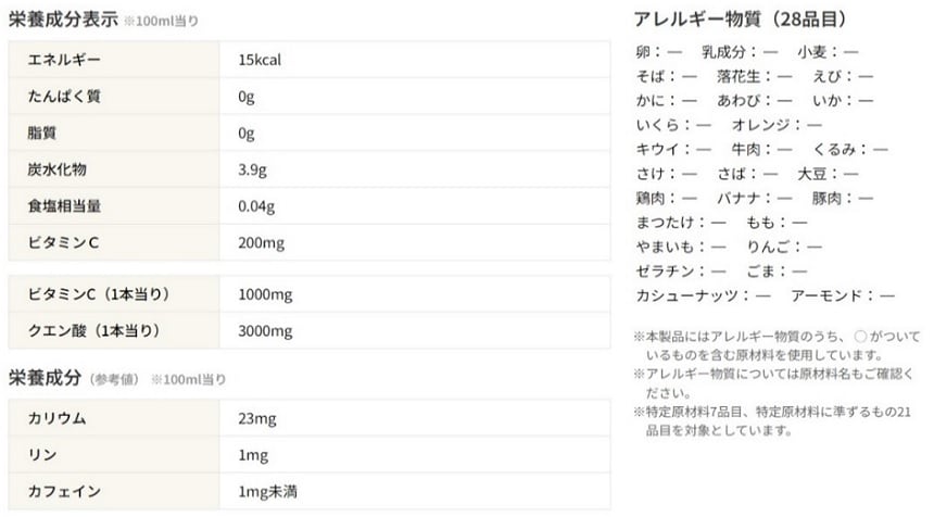 レモン(アルゼンチン、イスラエル)、果糖ぶどう糖液糖、レモン果皮エキス/炭酸、ビタミンC、甘味料(アセスルファムK、スクラロース)、香料、紅花色素