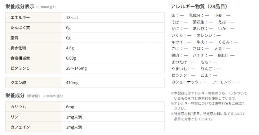 原材料:レモン果汁(レモン(イタリア))、砂糖、はちみつ、レモンペースト(果皮、果肉)、レモンピールエキス/酸味料、ビタミンC、甘味料(スクラロース、アセスルファムK)、香料、マリーゴールド色素