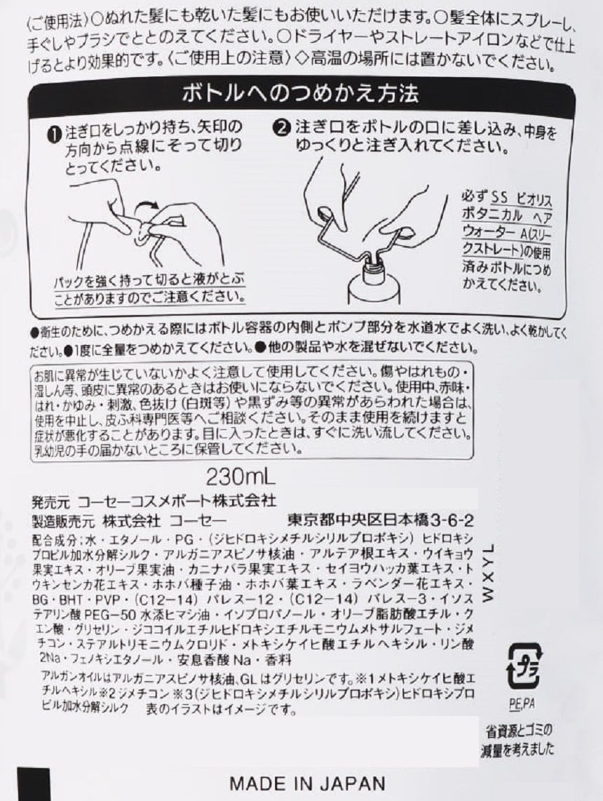 [12個]コーセーコスメポート サロンスタイル ビオリス ボタニカル ヘアウォーター(スリークストレート) つめかえ 230mL | 素早くうるおいを補給し、スタイリングしやすい髪に導くトリートメント
