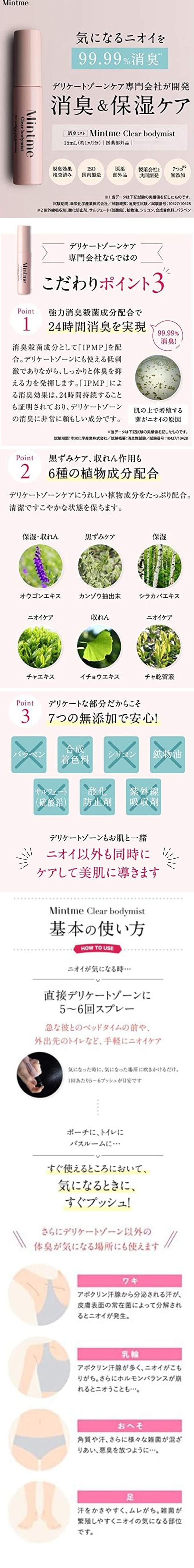 [20個]【医薬部外品】Mintme クリアボディミスト 15ml | デリケートゾーンやワキなど気になる臭いを消臭するミスト!低刺激で悪臭に99.99%臭いケア!