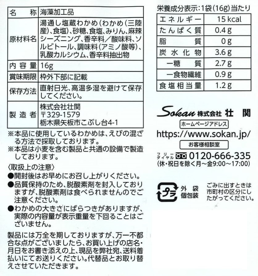 [30袋]壮関 麻辣茎わかめ 16g | 一味、花椒、ブラックペッパー等の香辛料を使用した後引く辛さの茎わかめです。