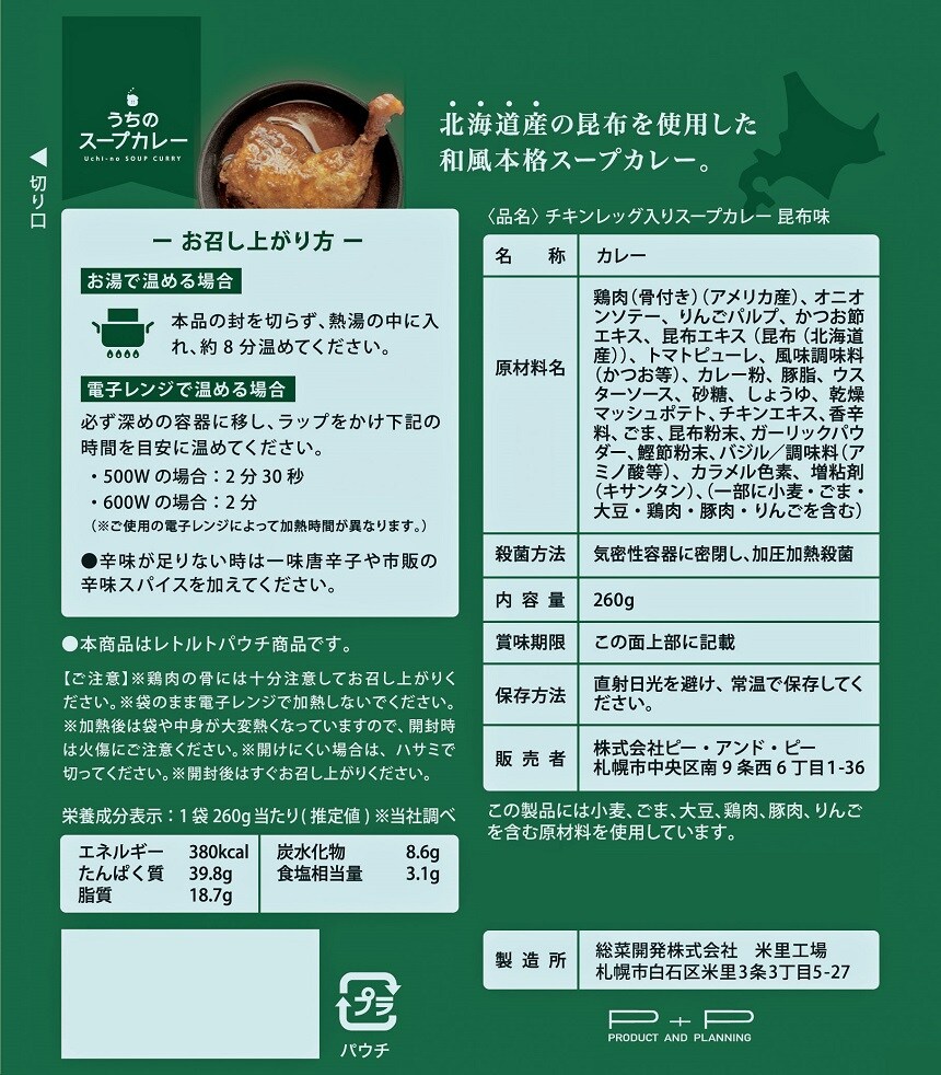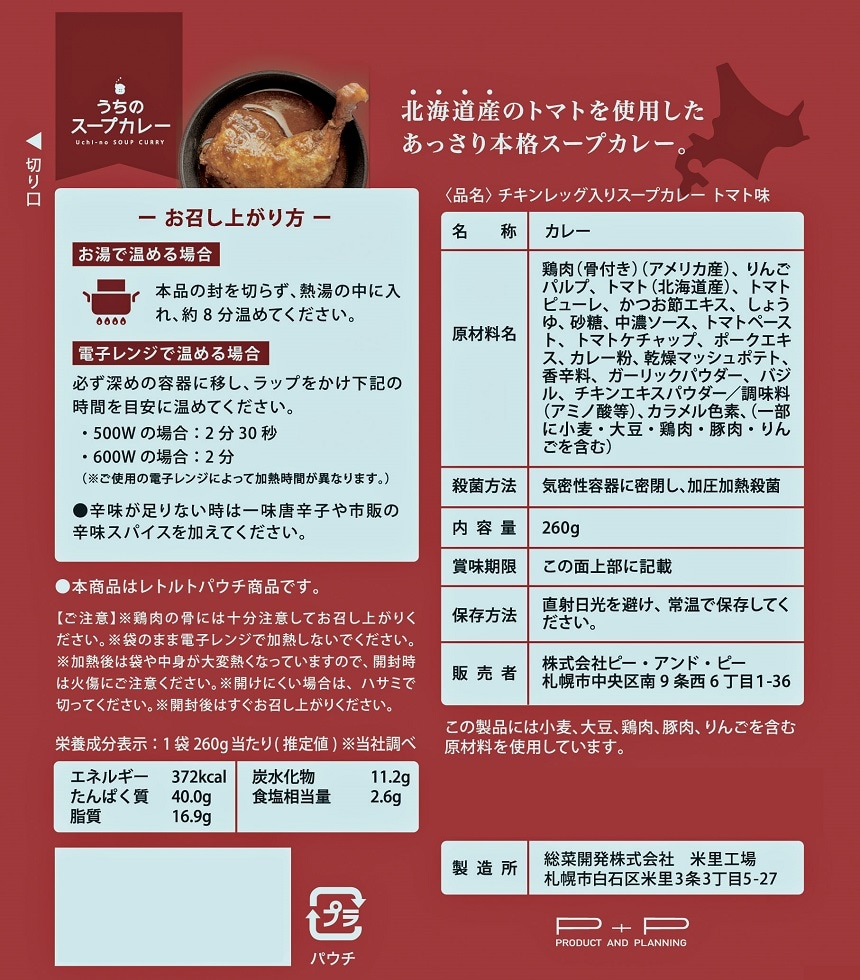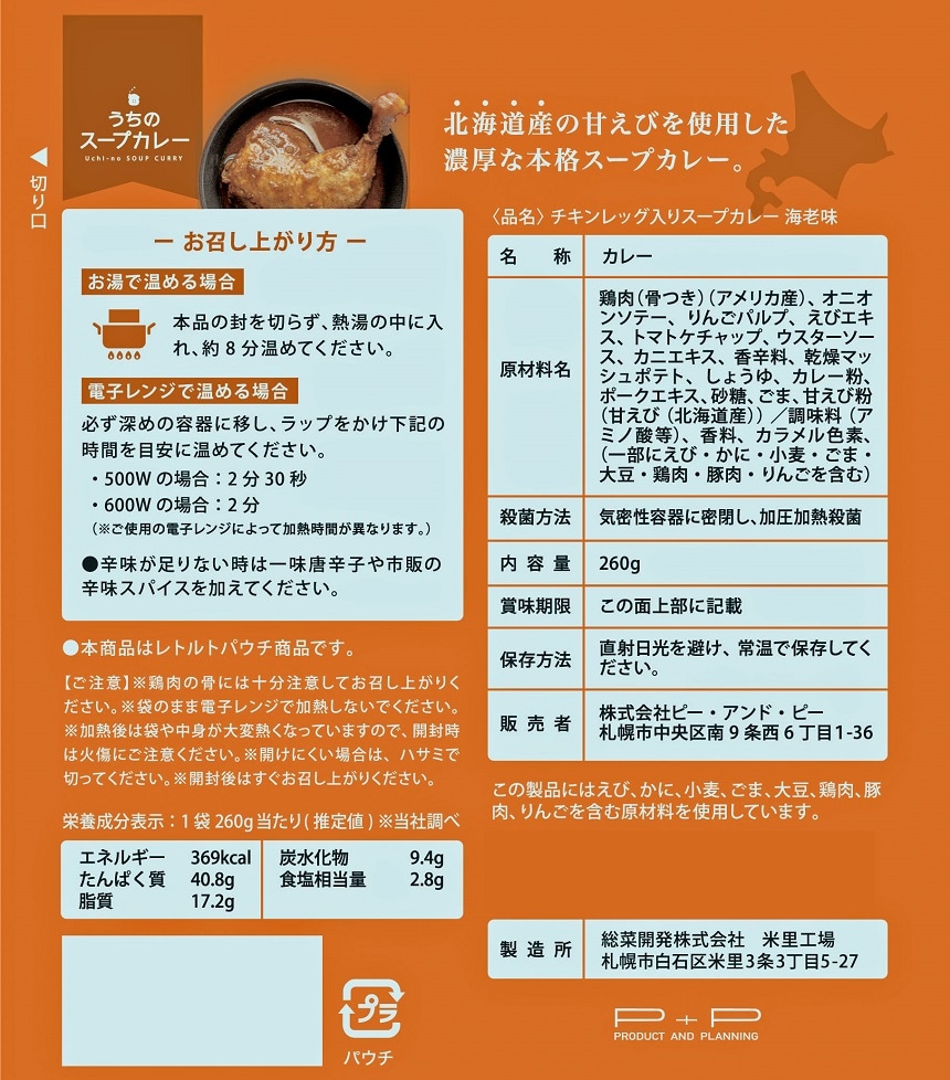 [3種計15個]ピー・アンド・ピー まるごとチキンレッグ入りスープカレー トマト味 260g / 海老味 260g / 昆布味 260g | 北海道生まれのスープカレー♪