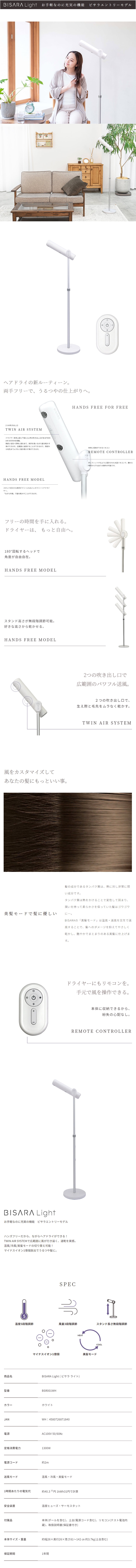 [ホワイト] ハンズフリースタンドヘアドライヤー BISARA Light (ビサラ ライト)|風をカスタマイズしてあなたの髪にもっといい事。フリーの時間を手に入れる。ドライヤーは、もっと自由へ。