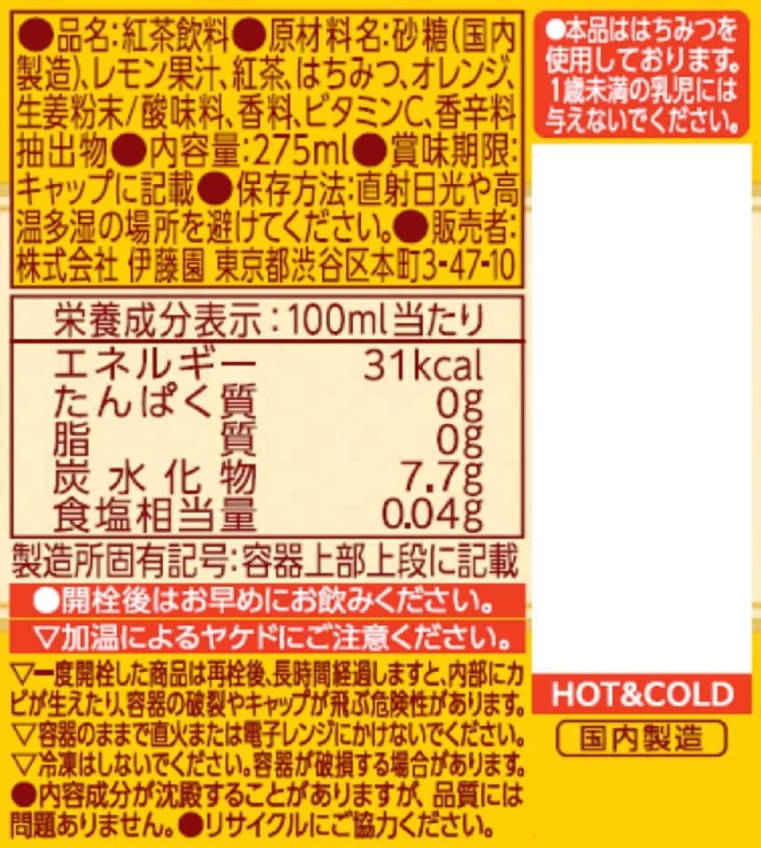 紅茶に西洋のホット飲料の定番であるジンジャーレモネードを組み合わせた、肌寒さを感じるこれからの時期にホッとお飲みいただける紅茶飲料です。