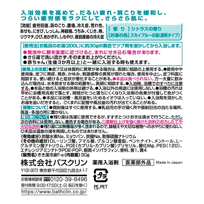 [120包]バスクリン きき湯 清涼炭酸湯 シトラスの香り 30g | その日の症状、その日のうちに。温泉科学のツブが効く。