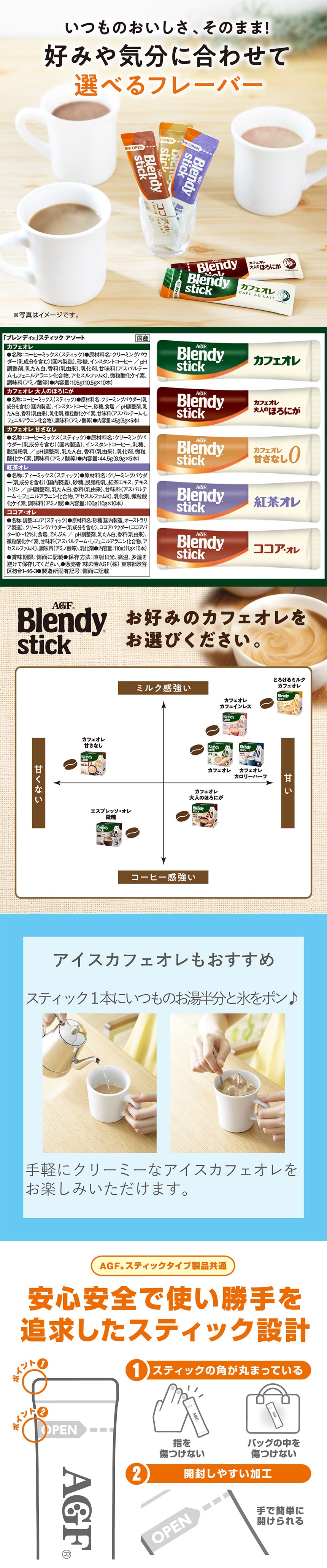 AGF(エージーエフ)ブレンディ スティック アソート40本は、いつものおいしさそのまま!好みや気分で選べる人気のカフェオレ、大人のほろにが、甘さなし、紅茶オレ、ココアオレの5種アソートパックです。