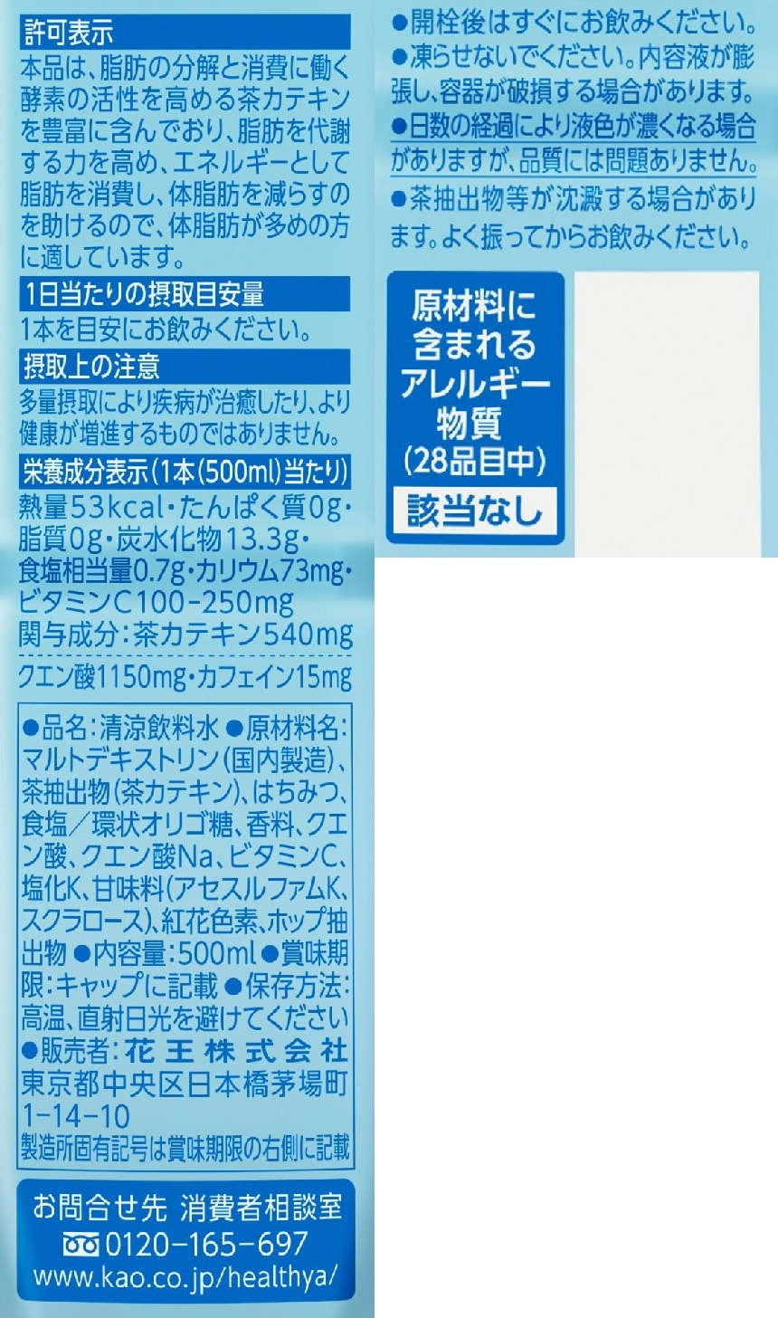 脂肪の分解と消費に働く酵素の活性を高める茶カテキンを豊富に含んでおり(一日の摂取目安量500ml当たり540mg)、脂肪を代謝する力を高め、エネルギーとして脂肪を消費し、体脂肪を減らすのを助けるので、体脂肪が多めの方に適しています。