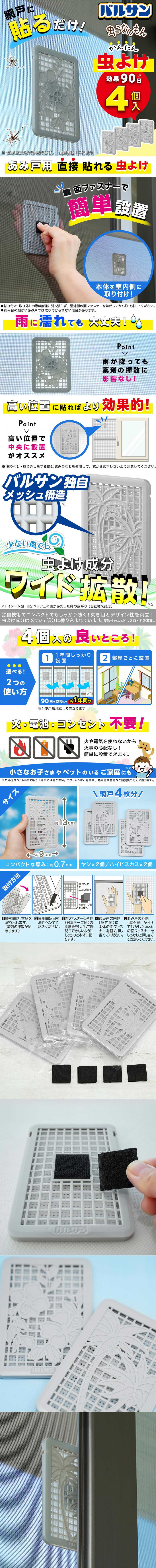 ●90日4個入りなので、いやな虫が増えているシーズンに、屋内外の境界面の網戸に網羅的に設置可能。