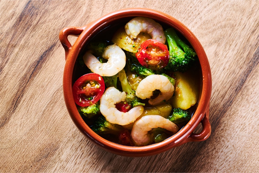にんにくが香るアヒージョソースとプリプリのエビが入ったアヒージョです。