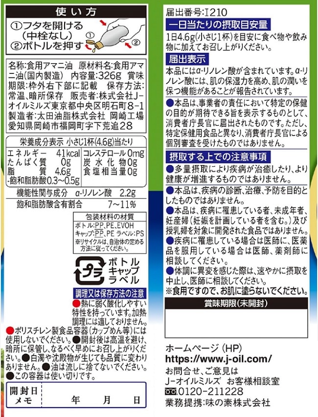 [6本]【機能性表示食品】J-オイルミルズ 「AJINOMOTO 毎日アマニ油」鮮度キープボトル 326g | α-リノレン酸の働きで肌の保湿力を高め、潤いを保つ機能性表示食品です。