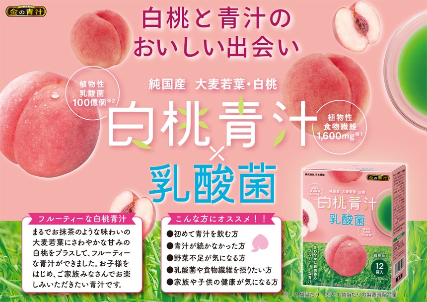 初めて青汁を飲む方、青汁が続かなかった方におすすめの、飲むのが楽しみになる、白桃香る青汁です。