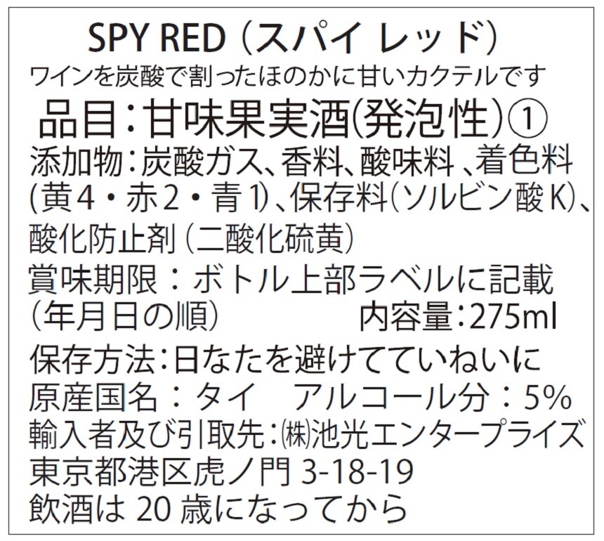 SPYレッドは、伝統的な地元の赤ぶどうから作られる赤ワインをベースに炭酸水、フルーツエキスなどをプラス。
