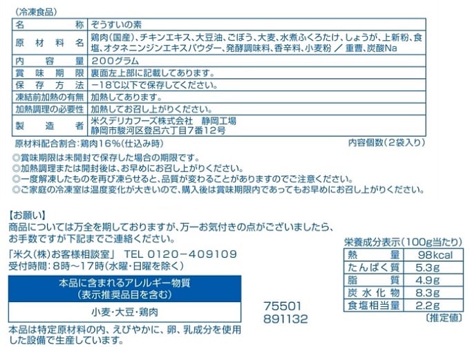 ・器にご飯100g・水150ccと解凍した製品を入れ、600W約1分30秒加熱し出来上がり