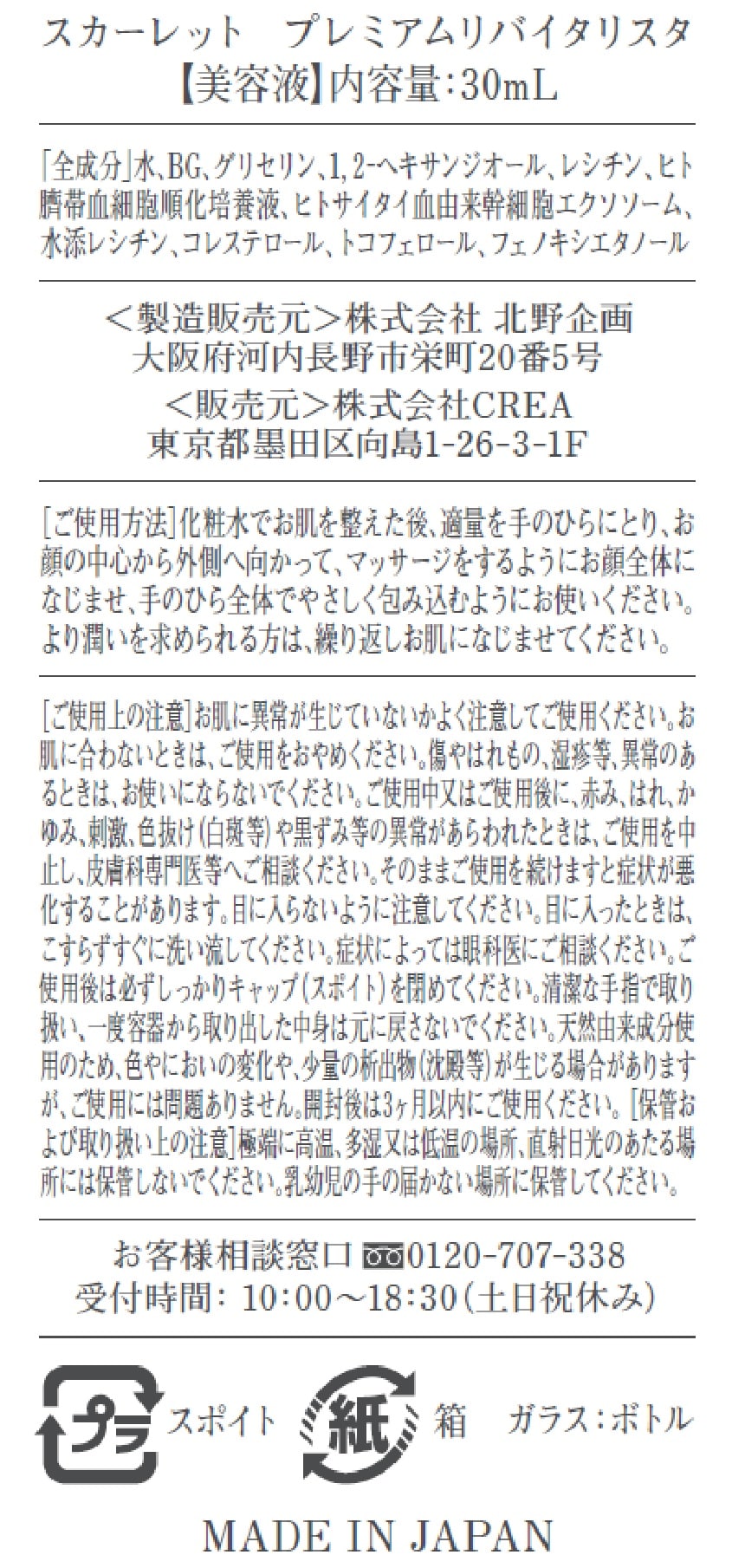 「ヒトさい帯⾎幹細胞培養液」と「ヒトさい帯⾎幹細胞エクソソーム」に着⽬し、原液配合したプレミアム原液美容液『スカーレット プレミアムリバイタリスタ』。