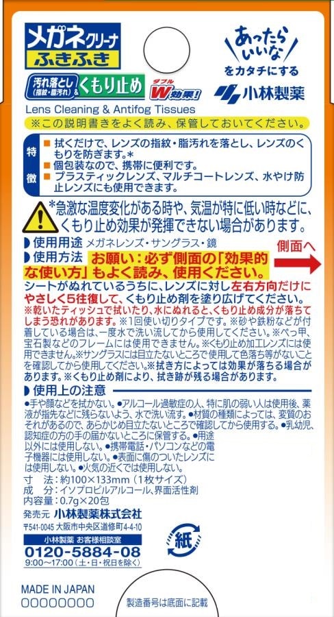 [計480包]小林製薬 メガネクリーナふきふきくもり止め 20包入×24個 | 拭くだけで、レンズの指紋・脂汚れを落とし、レンズのくもりを防ぎます。