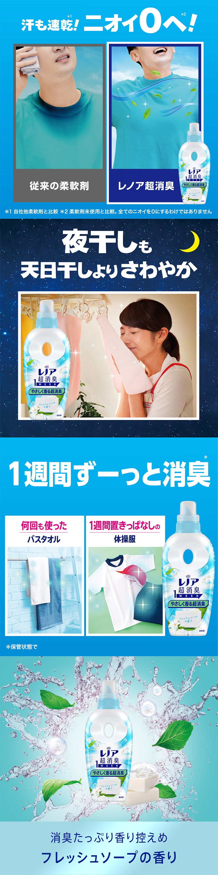 - レノア 超消臭1week 柔軟剤 やさしく香る超消臭 フレッシュソープの香り つめかえ 超特大 1280ml