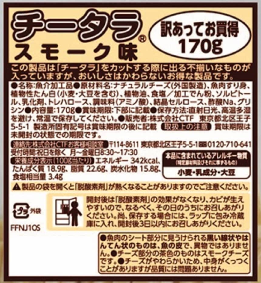 この製品はチータラをカットする際に出る不揃いのものが入ってますが、おいしさはかわりません。