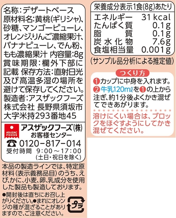 ザク切りの黄桃果肉が入った牛乳や豆乳でつくるフルーツオレの素