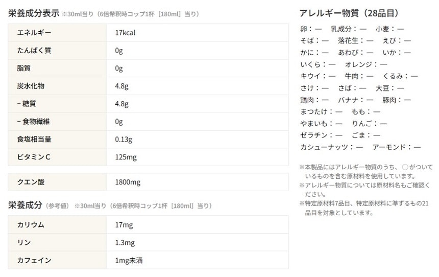 レモン果汁(レモン(アルゼンチン))、砂糖、醸造酢、レモン果皮エキス/酸味料、ビタミンC、甘味料(スクラロース、アセスルファムK)、香料