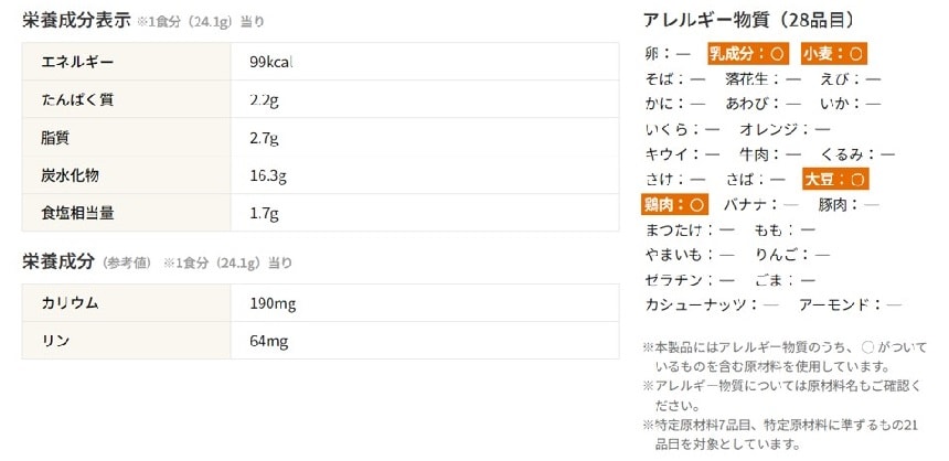 乾燥パン(国内製造)、乳糖、ホエイパウダー、クリーミングパウダー、トマトパウダー、調味カレーパウダー加工品、調味鶏肉パウダー、砂糖、じゃがいもパウダー、食塩、オニオンパウダー、ミルポアパウダー、バター加工品、チーズパウダー、トマト調味料、香辛料、粉末発酵調味料/増粘剤(加工でん粉、グァーガム)、調味料(アミノ酸等)、微粒二酸化ケイ素、酸化防止剤(ビタミンE)、香料、(一部に小麦・乳成分・大豆・鶏肉を含む)