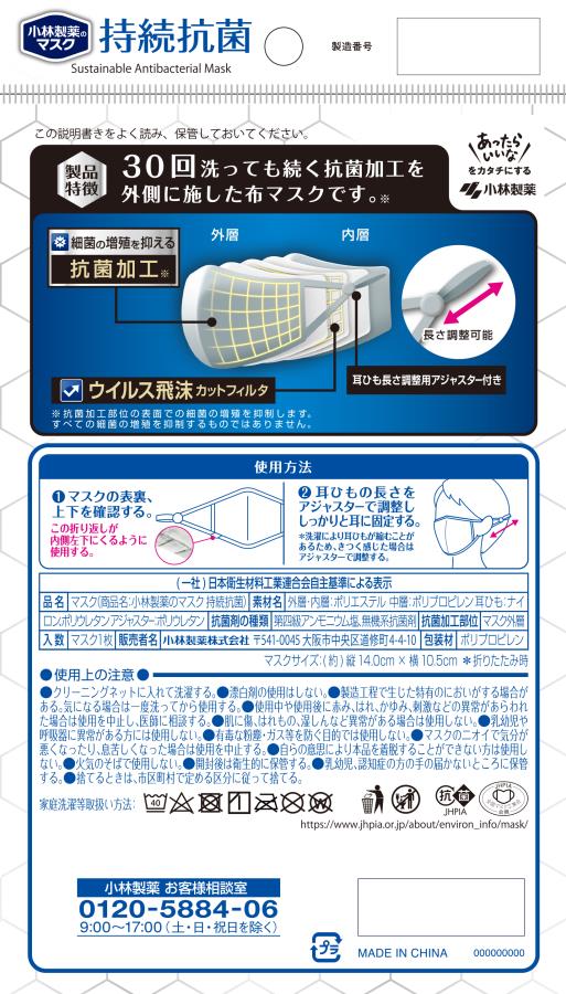 30回洗っても続く抗菌加工を外側に施した布マスクです。※