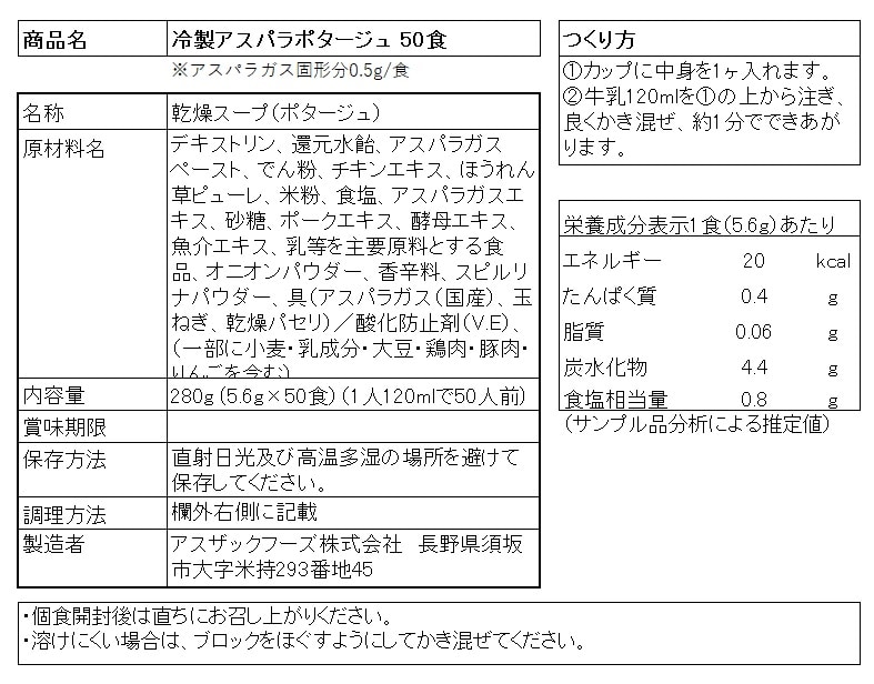 [計100食]アスザックフーズ 冷製アスパラポタージュ 50食入×2袋 | 冷たい牛乳で溶かすだけ!
