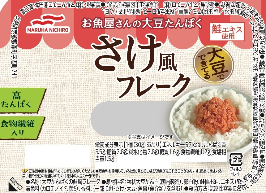 大豆たんぱくを主原料に、鮭フレーク風に味付けしたフレーク製品です。