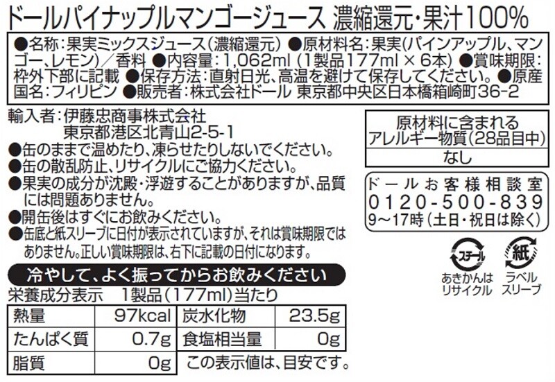- ドール パイナップルマンゴージュース 177ml×6本入