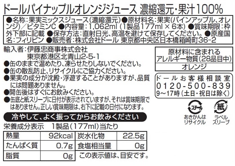 - ドール パイナップルオレンジジュース 177ml×6本入