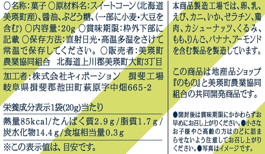 「北海道のさくさく焼きとうきび」は、美瑛町で育てられた甘みたっぷりの「とうきび」にしょうゆをあわせてフリーズドライにした「焼きとうきび」味のスナックです。
