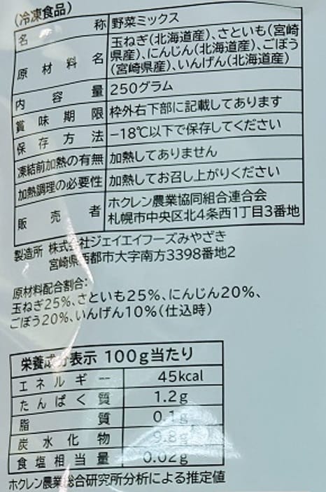 北海道産の玉ねぎ・にんじん・いんげんと宮崎県産のさといも・ごぼうをミックスしました。